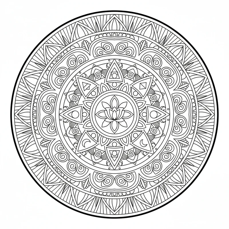 Drucken Sie diese Mandala-Malvorlage kostenlos aus und genießen Sie einen Moment der Ruhe und Konzentration. Ideal für Erwachsene und Kinder.