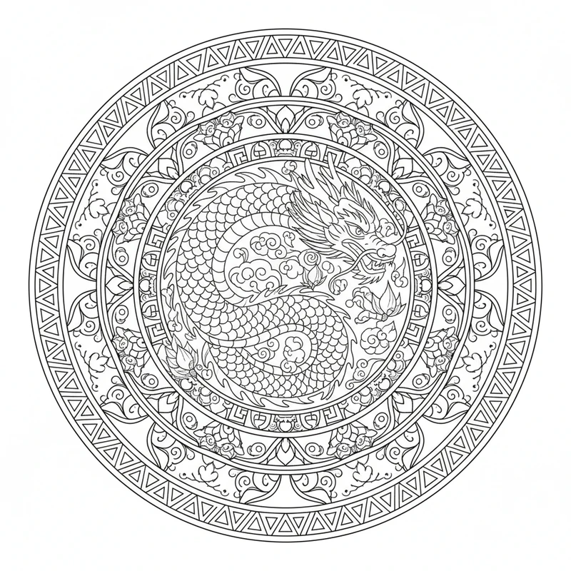 Entdecken Sie dieses wunderschöne Drachen Mandala Mandala zum Ausmalen. Ein einzigartiges Design inspiriert vom Thema Drachen Mandala, perfekt zum Stressabbau und zur Förderung der Kreativität.