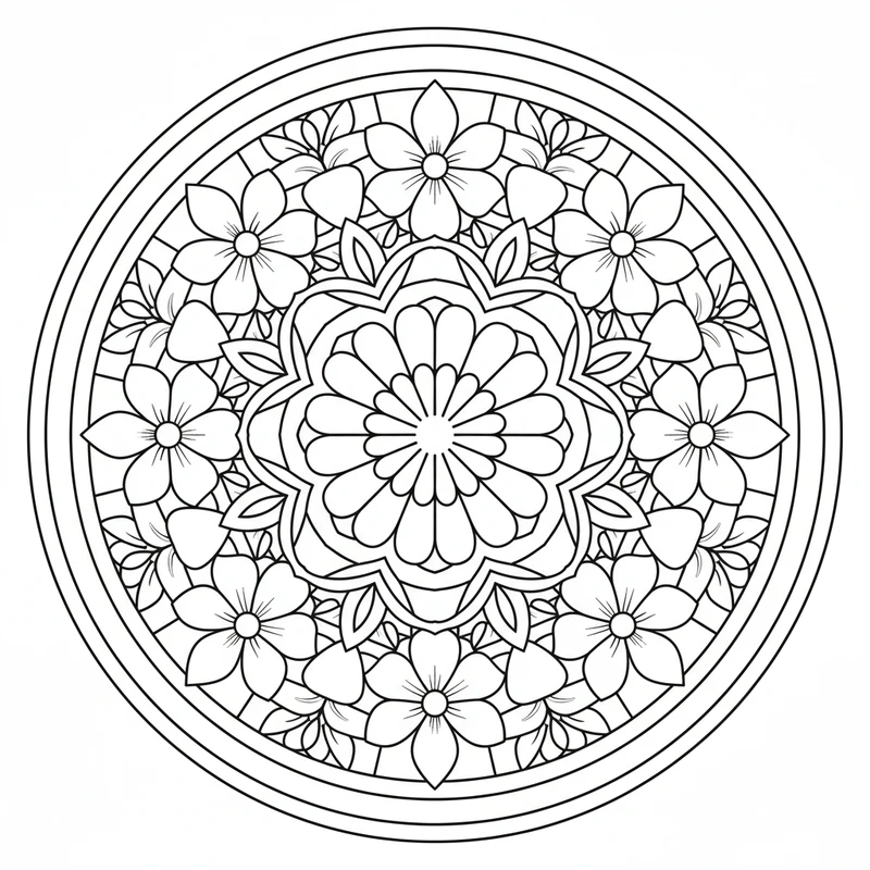 Drucken Sie diese Mandala-Malvorlage kostenlos aus und genießen Sie einen Moment der Ruhe und Konzentration. Ideal für Erwachsene und Kinder, die eine entspannende künstlerische Aktivität suchen.