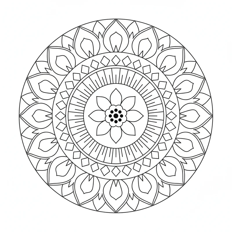 Drucken Sie diese Mandala-Malvorlage kostenlos aus und genießen Sie einen Moment der Ruhe und Konzentration. Ideal für Erwachsene und Kinder, die eine entspannende künstlerische Aktivität suchen.