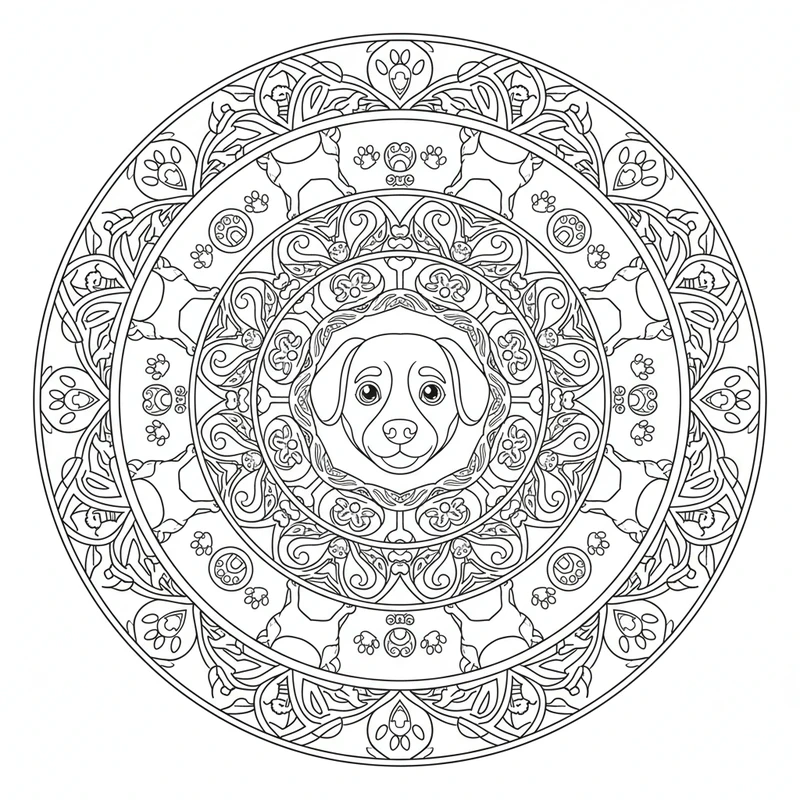 Entdecken Sie dieses wunderschöne Hunde Mandala Mandala zum Ausmalen. Ein einzigartiges Design inspiriert vom Thema Hunde Mandala, perfekt zum Stressabbau und zur Förderung der Kreativität.