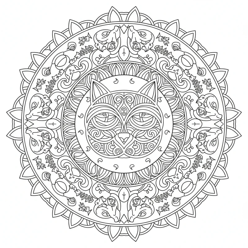 Entdecken Sie dieses wunderschöne Katzen Mandala Mandala zum Ausmalen. Ein einzigartiges Design inspiriert vom Thema Katzen Mandala, perfekt zum Stressabbau und zur Förderung der Kreativität.