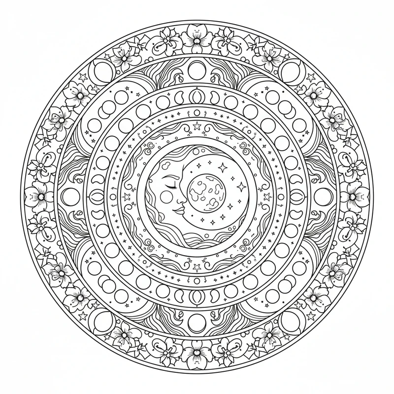 Entdecken Sie dieses wunderschöne Mond Mandala Mandala zum Ausmalen. Ein einzigartiges Design inspiriert vom Thema Mond Mandala, perfekt zum Stressabbau und zur Förderung der Kreativität.