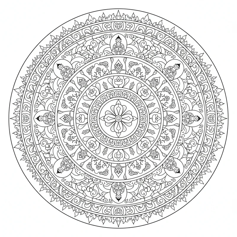 Entdecken Sie dieses wunderschöne Tibetisches Mandala Mandala zum Ausmalen. Ein einzigartiges Design inspiriert vom Thema Tibetisches Mandala, perfekt zum Stressabbau und zur Förderung der Kreativität.