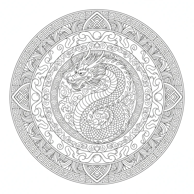 Discover this beautiful dragon mandala mandala coloring page. A unique design inspired by the dragon mandala theme, perfect for a moment of relaxation and creativity. The carefully crafted patterns offer a soothing coloring experience.