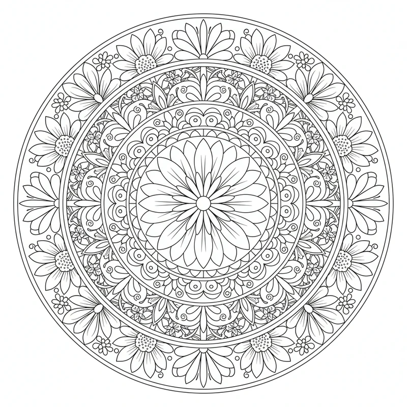 This mandala with floral patterns captures the essence of eternal spring. Lotus, roses and daisies intertwine in a harmonious circular composition. A coloring page that invites meditation and artistic expression.