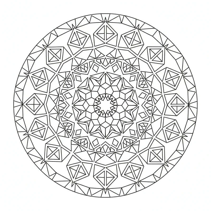 Explore mathematical perfection with this geometric mandala featuring fascinating symmetries. Inspired by sacred geometry, this design combines circles, triangles and hexagons in a captivating visual harmony.