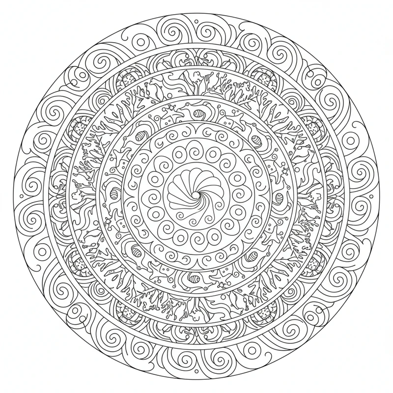 Discover this beautiful ocean mandala mandala coloring page. A unique design inspired by the ocean mandala theme, perfect for a moment of relaxation and creativity. The carefully crafted patterns offer a soothing coloring experience.
