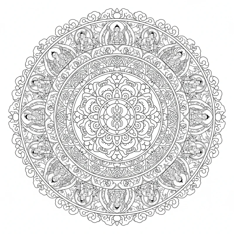 Discover this beautiful tibetan mandala mandala coloring page. A unique design inspired by the tibetan mandala theme, perfect for a moment of relaxation and creativity. The carefully crafted patterns offer a soothing coloring experience.