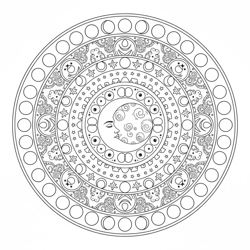 Descubre este hermoso mandala luna para colorear. Un diseño único inspirado en el tema luna, perfecto para reducir el estrés y estimular la creatividad.