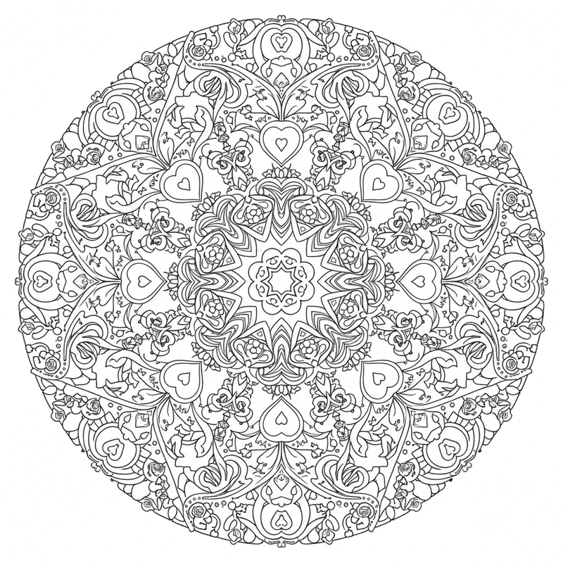 Descubre este hermoso mandala san valentín para colorear. Un diseño único inspirado en el tema san valentín, perfecto para reducir el estrés y estimular la creatividad.