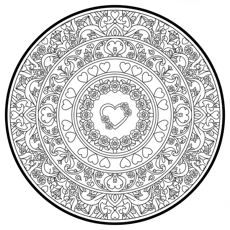 Descubre este hermoso mandala san valentín para colorear. Un diseño único inspirado en el tema san valentín, perfecto para reducir el estrés y estimular la creatividad.