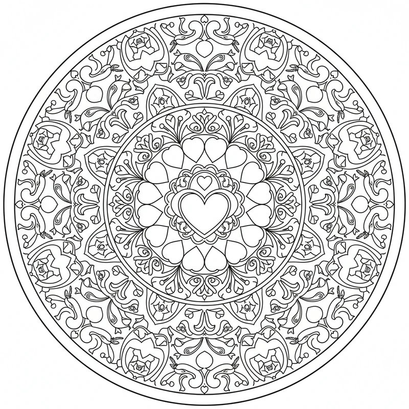 Descubre este hermoso mandala san valentín para colorear. Un diseño único inspirado en el tema san valentín, perfecto para reducir el estrés y estimular la creatividad.