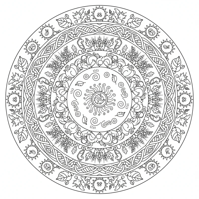 Scopri questo bellissimo mandala autunno da colorare. Un design unico ispirato al tema autunno, perfetto per ridurre lo stress e stimolare la creatività.