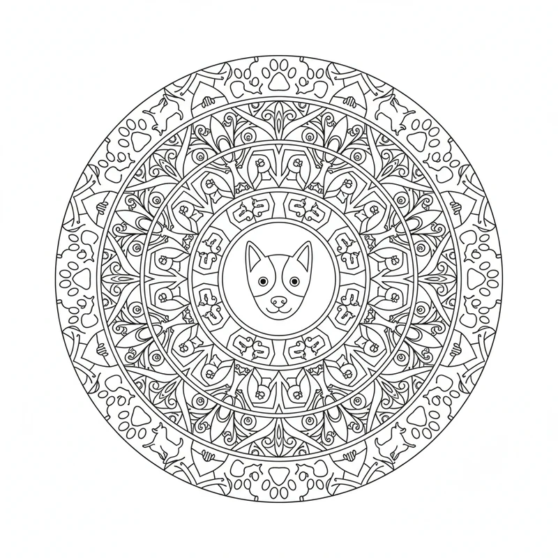 Scopri questo bellissimo mandala cane da colorare. Un design unico ispirato al tema cane, perfetto per ridurre lo stress e stimolare la creatività.