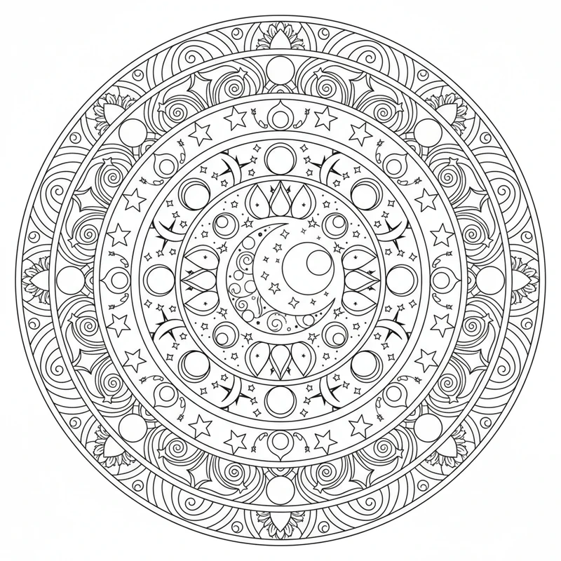 Scopri questo bellissimo mandala luna da colorare. Un design unico ispirato al tema luna, perfetto per ridurre lo stress e stimolare la creatività.