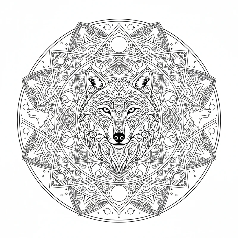 Scopri questo bellissimo mandala lupo da colorare. Un design unico ispirato al tema lupo, perfetto per ridurre lo stress e stimolare la creatività.