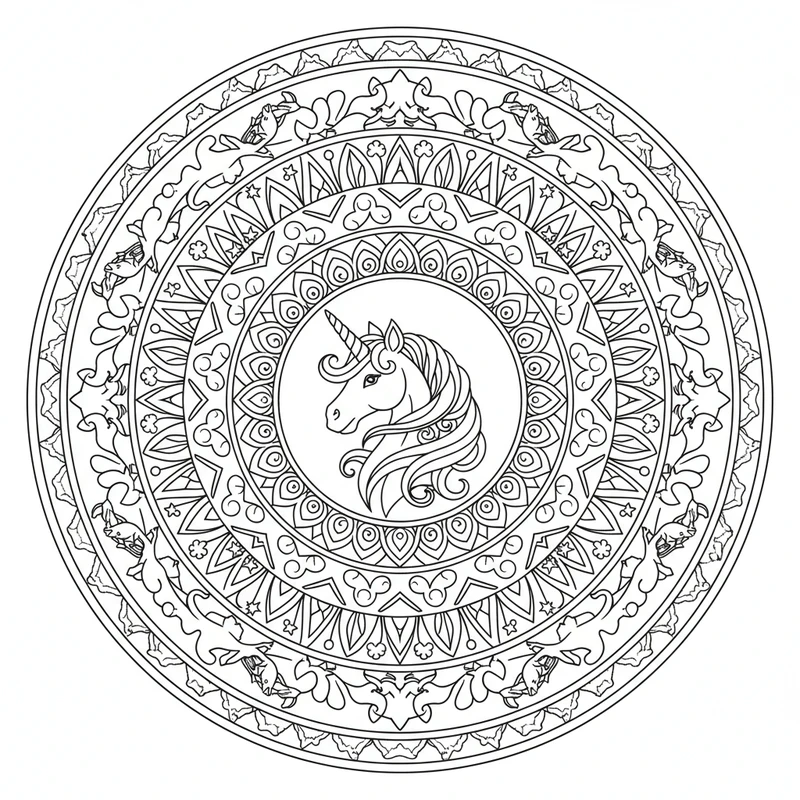 Scopri questo bellissimo mandala unicorno da colorare. Un design unico ispirato al tema unicorno, perfetto per ridurre lo stress e stimolare la creatività.