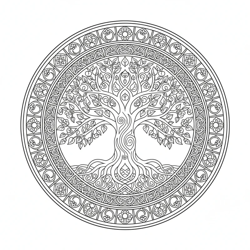 Découvrez ce magnifique mandala arbre de vie à colorier. Un design unique inspiré du thème arbre de vie, parfait pour un moment de détente et de créativité. Les motifs soigneusement élaborés offrent une expérience de coloriage apaisante.