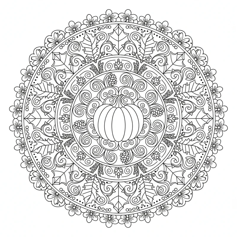 Ce mandala automne est idéal pour réduire le stress et stimuler votre imagination. Téléchargez gratuitement ce coloriage et laissez-vous transporter par la beauté de ce design automne. Parfait pour adultes et enfants.
