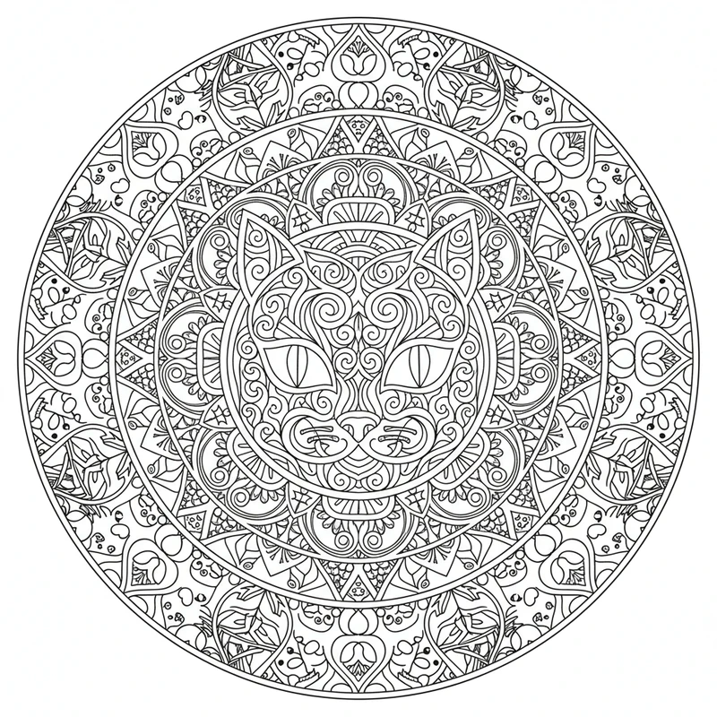 Découvrez ce magnifique mandala chat à colorier. Un design unique inspiré du thème chat, parfait pour un moment de détente et de créativité. Les motifs soigneusement élaborés offrent une expérience de coloriage apaisante.