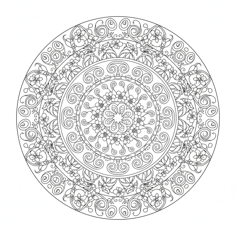 Ce mandala aux motifs floraux capture l'essence du printemps éternel. Lotus, roses et marguerites s'entrelacent dans une composition circulaire harmonieuse. Un coloriage qui invite à la méditation et à l'expression artistique.