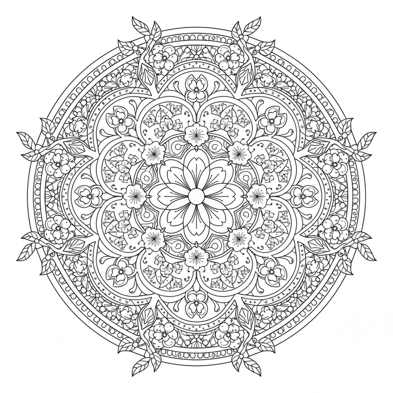Ce mandala aux motifs floraux capture l'essence du printemps éternel. Lotus, roses et marguerites s'entrelacent dans une composition circulaire harmonieuse. Un coloriage qui invite à la méditation et à l'expression artistique.