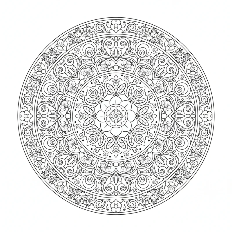 Ce mandala aux motifs floraux capture l'essence du printemps éternel. Lotus, roses et marguerites s'entrelacent dans une composition circulaire harmonieuse. Un coloriage qui invite à la méditation et à l'expression artistique.