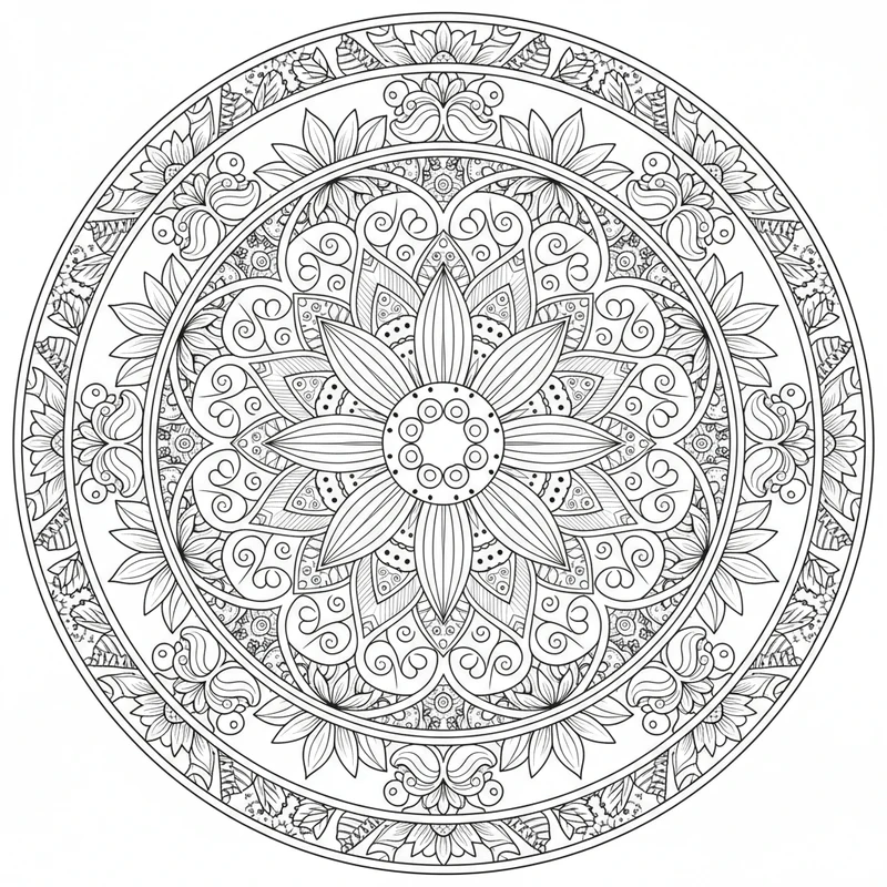 Plongez dans la beauté naturelle avec ce mandala floral aux motifs délicats de fleurs et de pétales. Chaque courbe évoque la grâce des jardins en pleine floraison. Un design parfait pour les amoureux de la nature et du coloriage créatif.