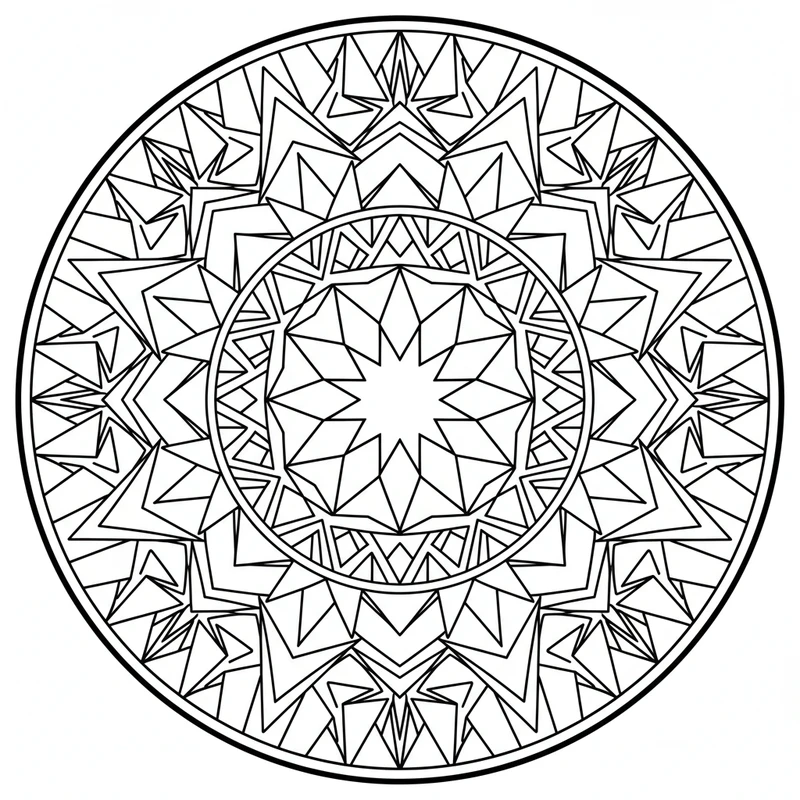 Ce mandala aux formes géométriques précises invite à un voyage au cœur de l'ordre et de la beauté mathématique. Les lignes nettes et les symétries multiples offrent un support de coloriage sophistiqué pour les amateurs de précision.