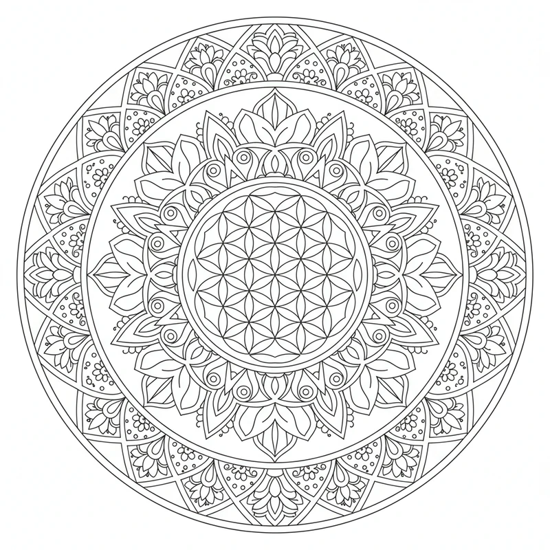 Les motifs répétitifs de ce mandala créent un effet hypnotique propice à la méditation profonde. Chaque forme s'imbrique parfaitement dans l'ensemble, offrant un défi créatif stimulant. Téléchargez gratuitement ce coloriage pour une expérience zen unique.