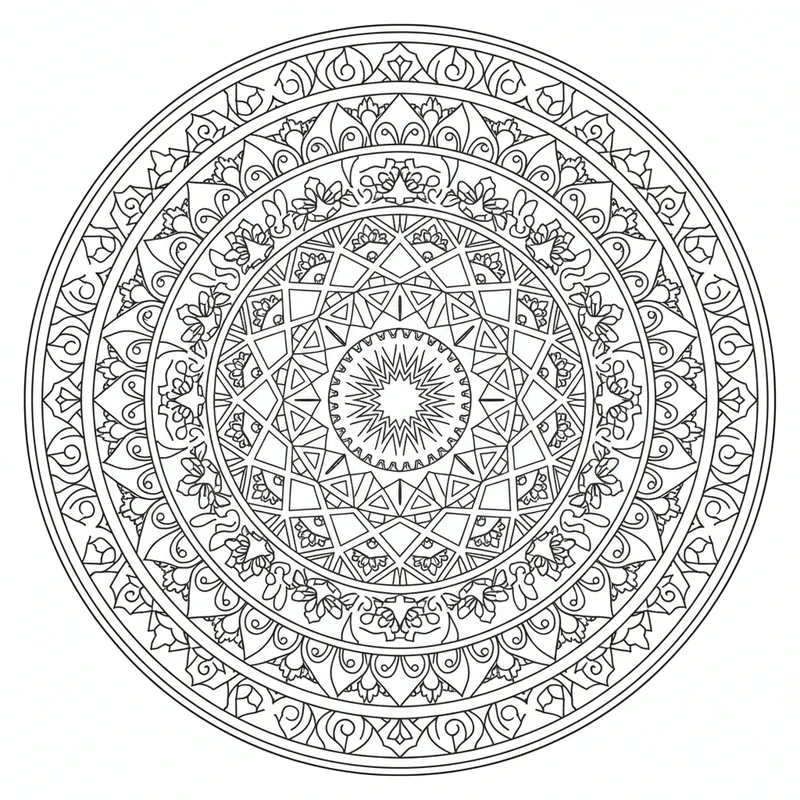 Ce mandala aux formes géométriques précises invite à un voyage au cœur de l'ordre et de la beauté mathématique. Les lignes nettes et les symétries multiples offrent un support de coloriage sophistiqué pour les amateurs de précision.