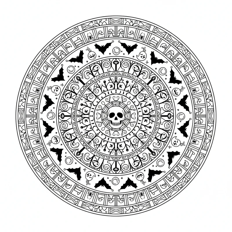 Découvrez ce magnifique mandala halloween à colorier. Un design unique inspiré du thème halloween, parfait pour un moment de détente et de créativité. Les motifs soigneusement élaborés offrent une expérience de coloriage apaisante.