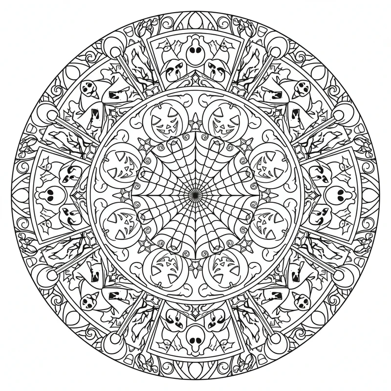 Découvrez ce magnifique mandala halloween à colorier. Un design unique inspiré du thème halloween, parfait pour un moment de détente et de créativité. Les motifs soigneusement élaborés offrent une expérience de coloriage apaisante.