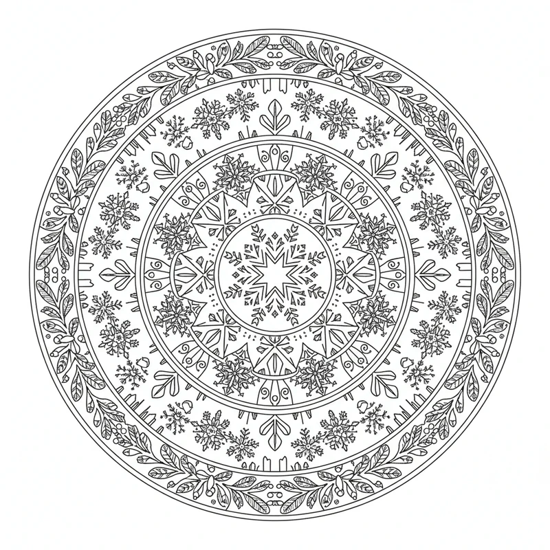 Ce mandala hiver est idéal pour réduire le stress et stimuler votre imagination. Téléchargez gratuitement ce coloriage et laissez-vous transporter par la beauté de ce design hiver. Parfait pour adultes et enfants.