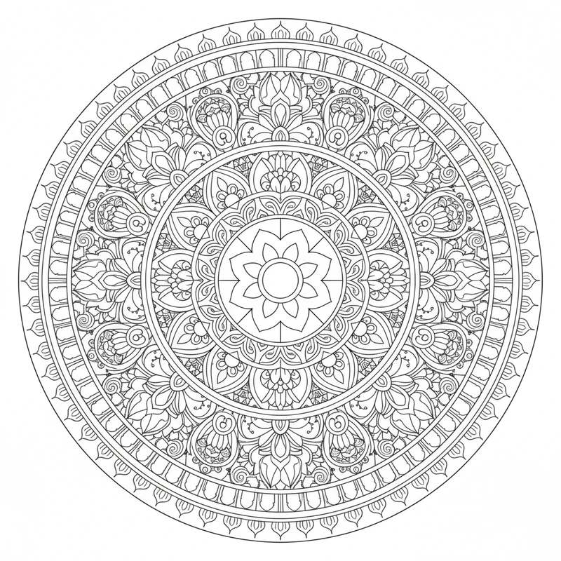 Ce mandala indien est idéal pour réduire le stress et stimuler votre imagination. Téléchargez gratuitement ce coloriage et laissez-vous transporter par la beauté de ce design indien. Parfait pour adultes et enfants.