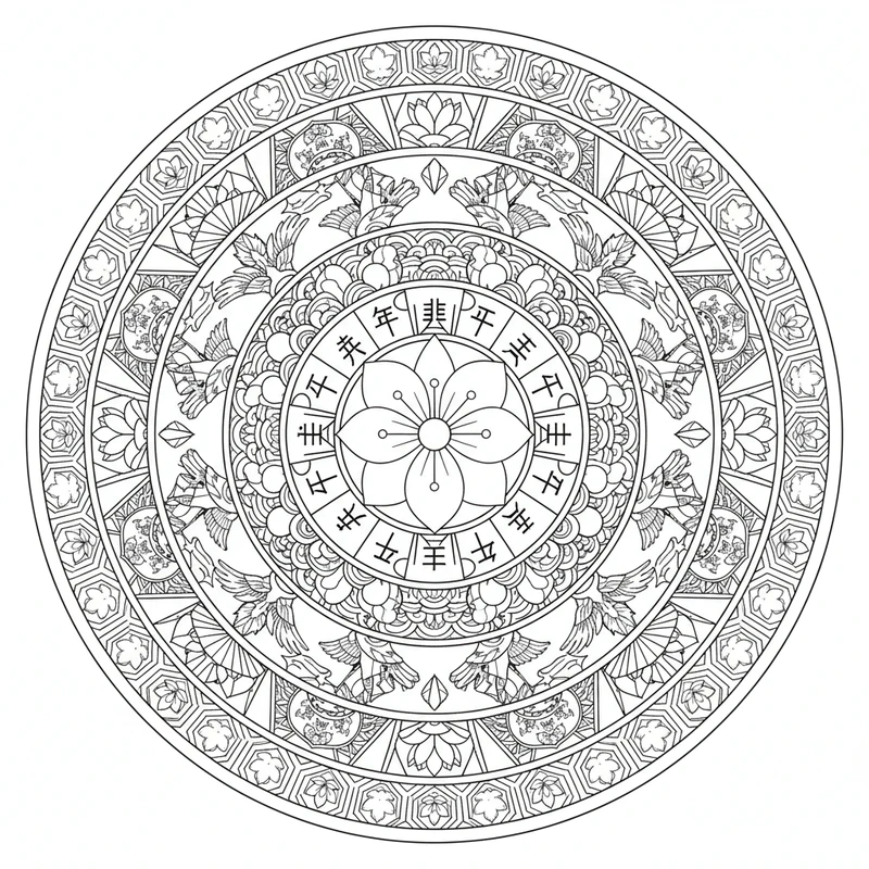 Découvrez ce magnifique mandala japonais à colorier. Un design unique inspiré du thème japonais, parfait pour un moment de détente et de créativité. Les motifs soigneusement élaborés offrent une expérience de coloriage apaisante.