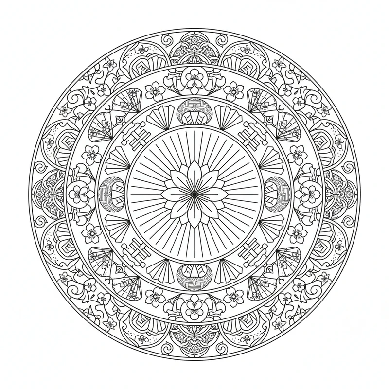 Découvrez ce magnifique mandala japonais à colorier. Un design unique inspiré du thème japonais, parfait pour un moment de détente et de créativité. Les motifs soigneusement élaborés offrent une expérience de coloriage apaisante.