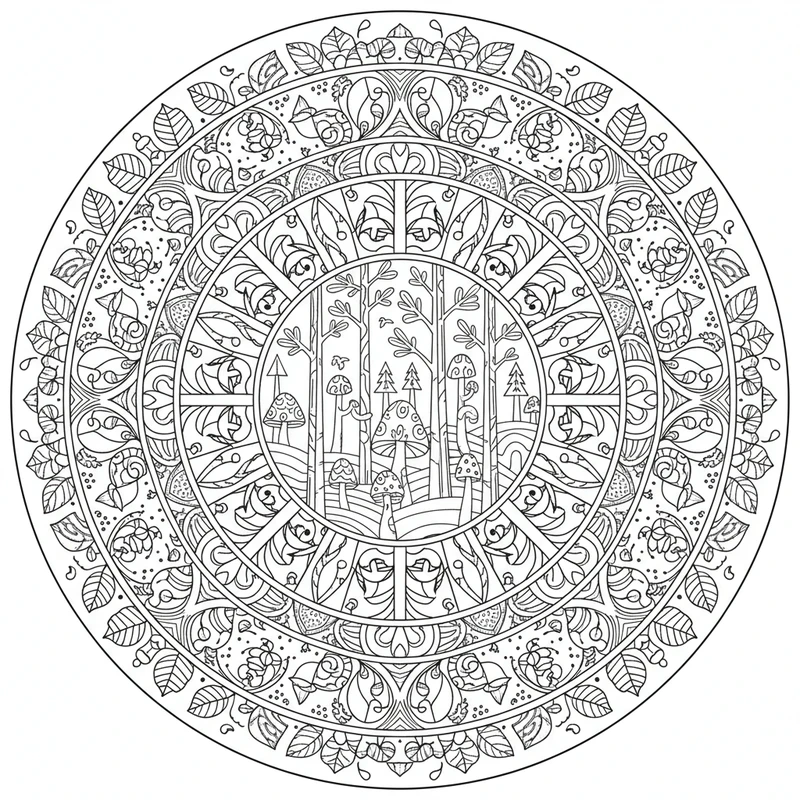 Reconnectez-vous à la Terre avec ce mandala nature inspiré des éléments naturels. Feuilles, vagues, montagnes et forêts se rejoignent dans une célébration circulaire de notre planète. Un coloriage qui apaise l'âme.
