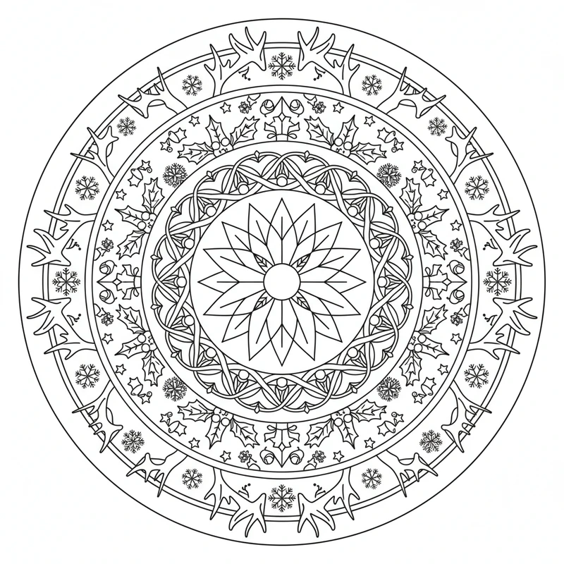Ce mandala noël est idéal pour réduire le stress et stimuler votre imagination. Téléchargez gratuitement ce coloriage et laissez-vous transporter par la beauté de ce design noël. Parfait pour adultes et enfants.