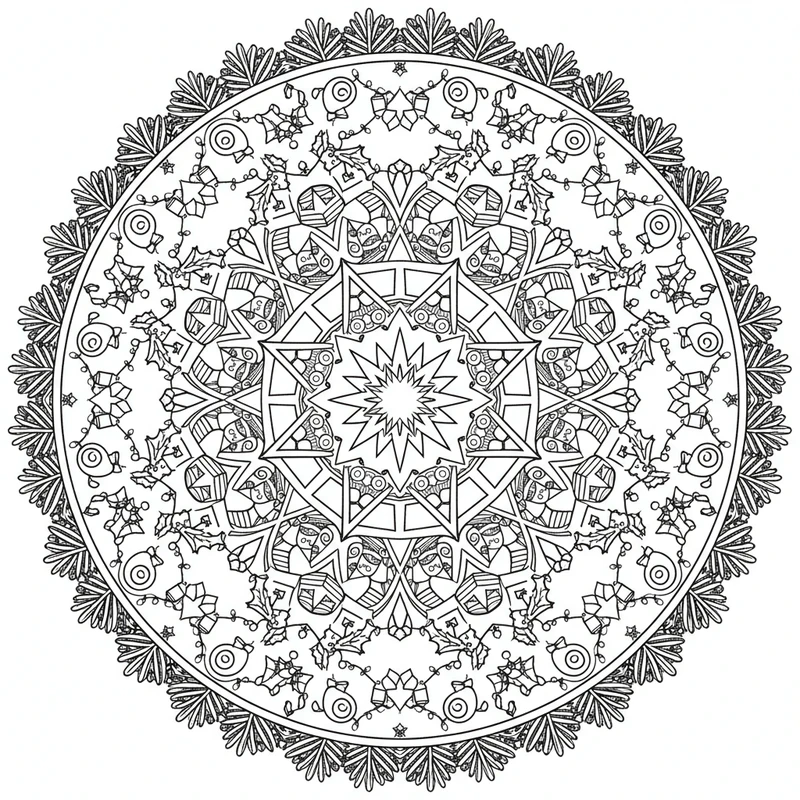 Ce mandala noël est idéal pour réduire le stress et stimuler votre imagination. Téléchargez gratuitement ce coloriage et laissez-vous transporter par la beauté de ce design noël. Parfait pour adultes et enfants.