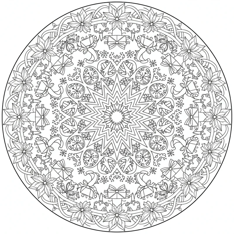 Ce mandala noël est idéal pour réduire le stress et stimuler votre imagination. Téléchargez gratuitement ce coloriage et laissez-vous transporter par la beauté de ce design noël. Parfait pour adultes et enfants.