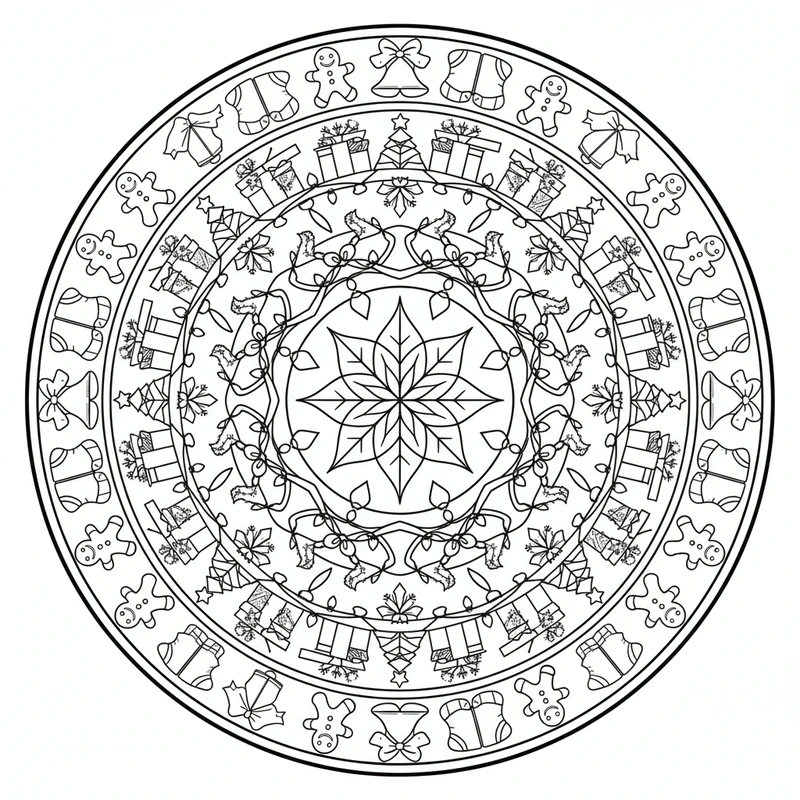 Ce mandala noël est idéal pour réduire le stress et stimuler votre imagination. Téléchargez gratuitement ce coloriage et laissez-vous transporter par la beauté de ce design noël. Parfait pour adultes et enfants.