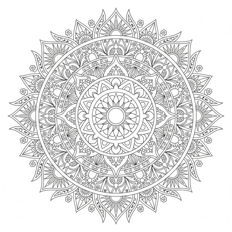 Découvrez ce magnifique mandala soleil à colorier. Un design unique inspiré du thème soleil, parfait pour un moment de détente et de créativité. Les motifs soigneusement élaborés offrent une expérience de coloriage apaisante.