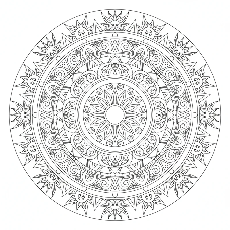 Découvrez ce magnifique mandala soleil à colorier. Un design unique inspiré du thème soleil, parfait pour un moment de détente et de créativité. Les motifs soigneusement élaborés offrent une expérience de coloriage apaisante.