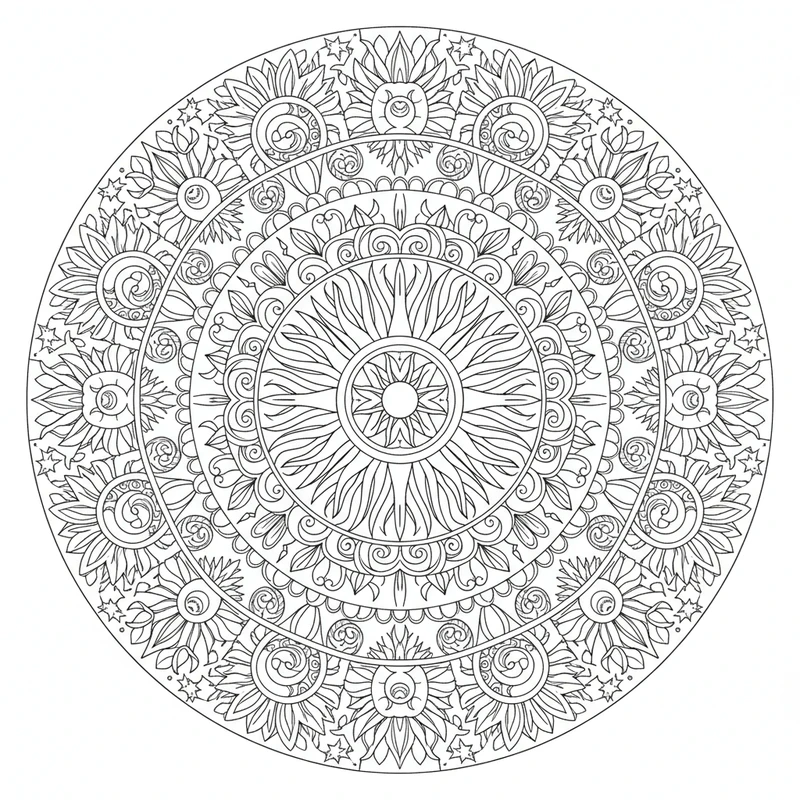 Ce mandala soleil est idéal pour réduire le stress et stimuler votre imagination. Téléchargez gratuitement ce coloriage et laissez-vous transporter par la beauté de ce design soleil. Parfait pour adultes et enfants.