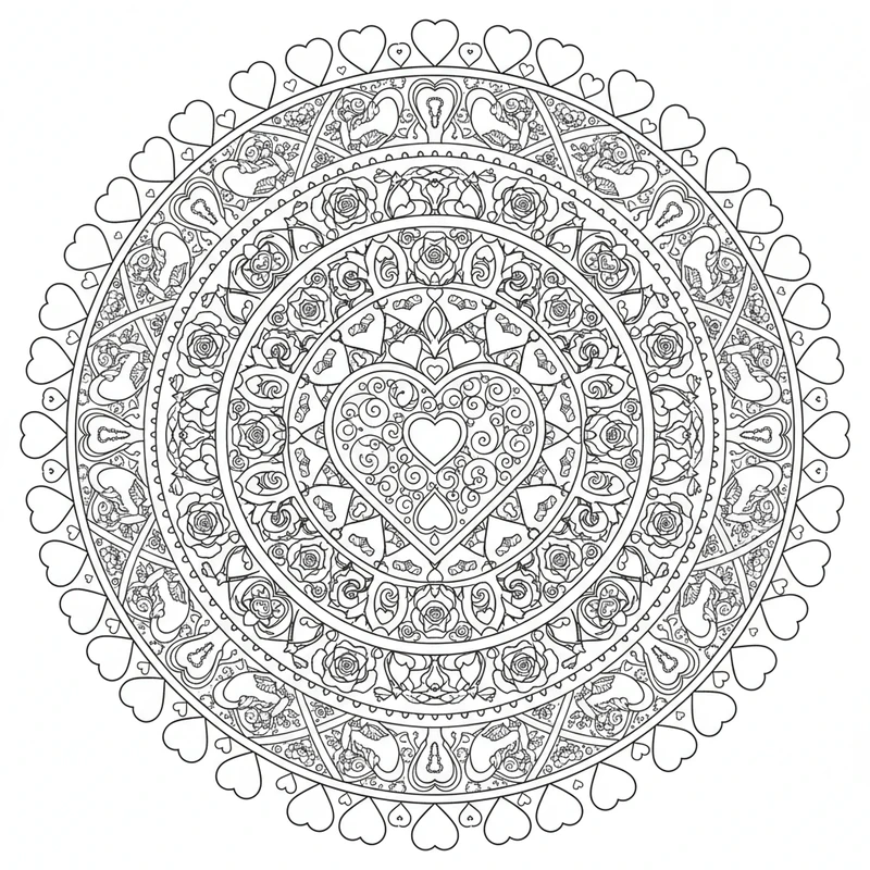 Descubra esta bela mandala dia dos namorados para colorir. Um design único inspirado no tema dia dos namorados, perfeito para reduzir o estresse e estimular a criatividade.