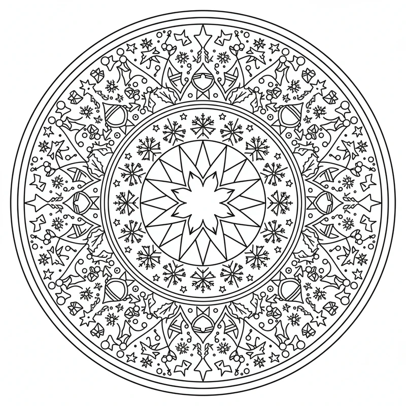Descubra esta bela mandala natal para colorir. Um design único inspirado no tema natal, perfeito para reduzir o estresse e estimular a criatividade.