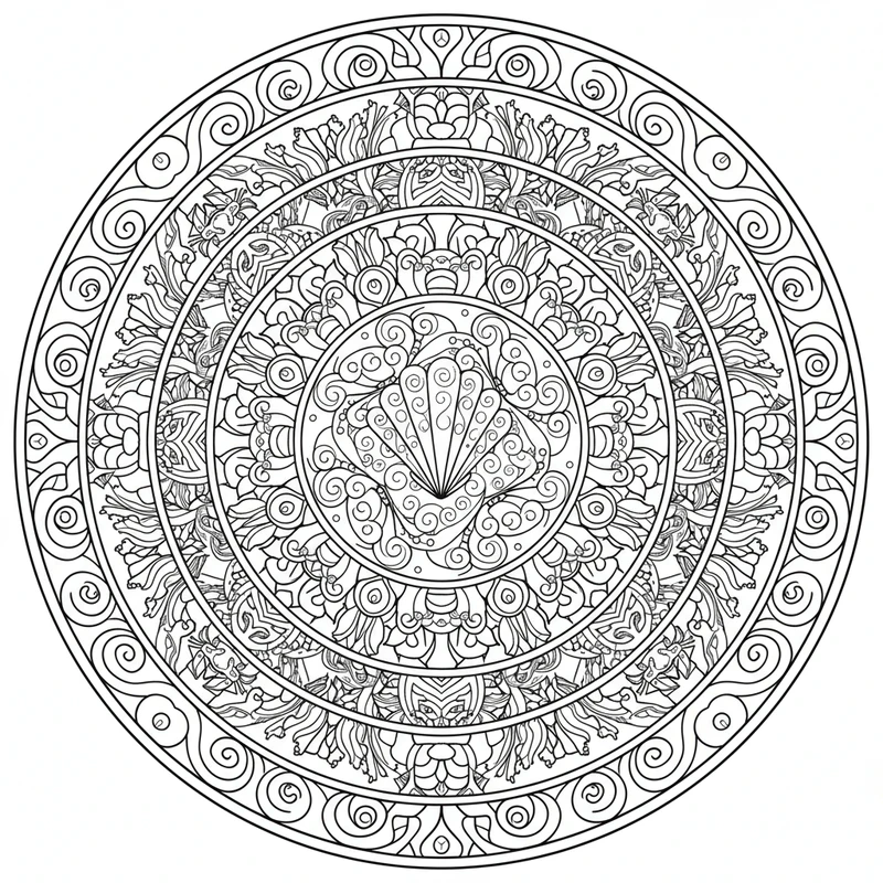 Descubra esta bela mandala oceano para colorir. Um design único inspirado no tema oceano, perfeito para reduzir o estresse e estimular a criatividade.