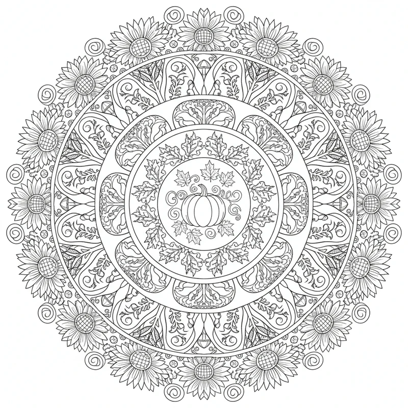 Descubra esta bela mandala outono para colorir. Um design único inspirado no tema outono, perfeito para reduzir o estresse e estimular a criatividade.